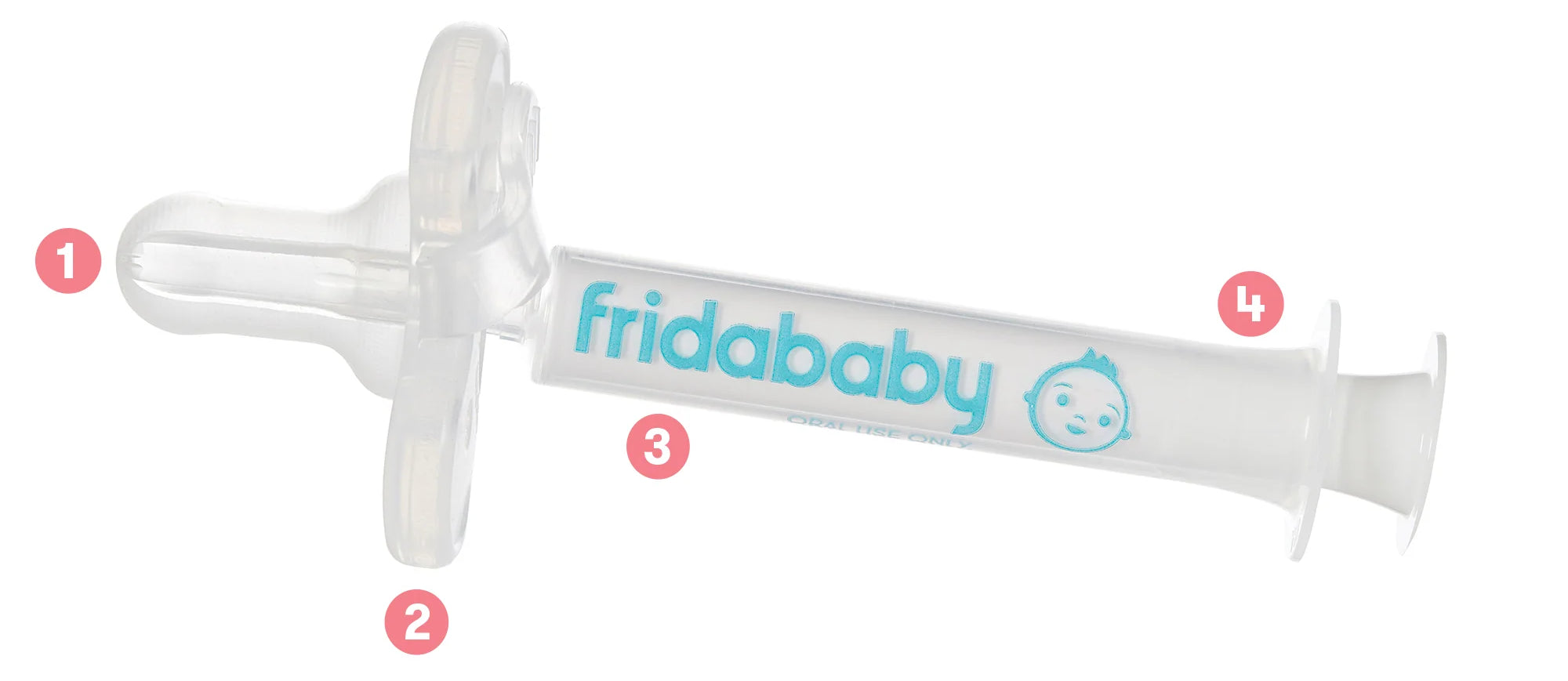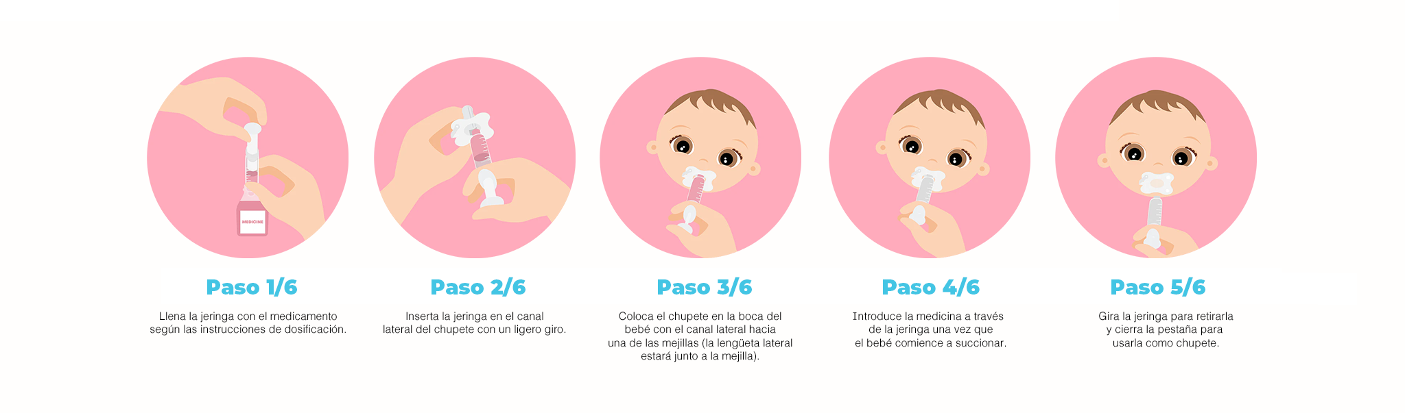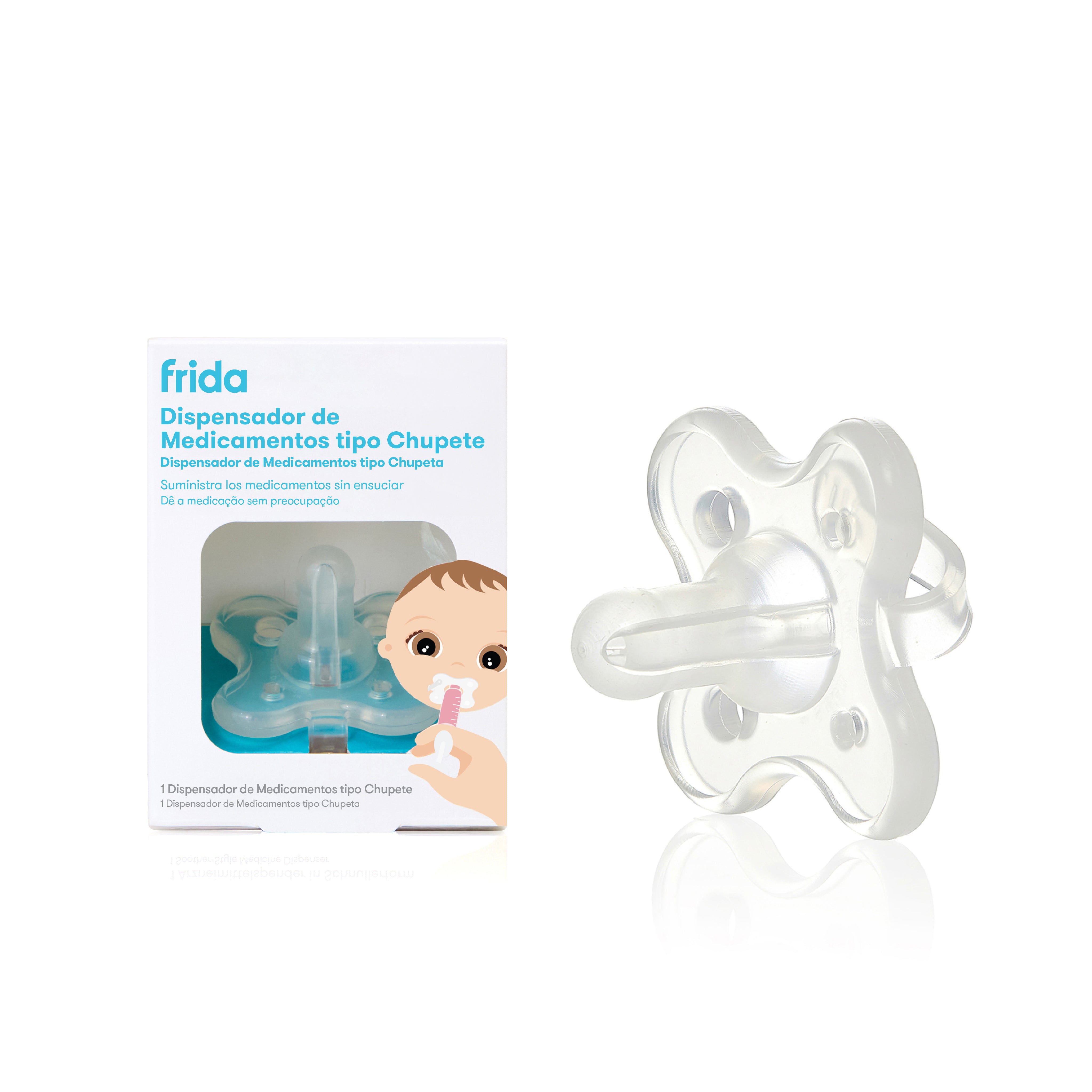 Llena la jeringa con la dosis recomendada y administra la medicina a través del chupete lentamente. Usa el chupete normalmente para calmar al bebé después de de administrar la medicina. Lavar antes y después de cada uso (apto para lavavajillas).